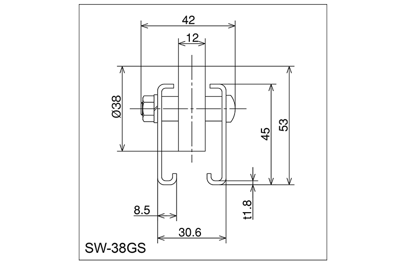 | SW-38GS | 38 × 12 × 6 × 27 | M6 × 38L | 45 × 31 × 8.5 × 42 × 1.8 | 53 | 1800 · 2400 · 3000 | 50 · 75 · 100 · 150 | 30 | POM |